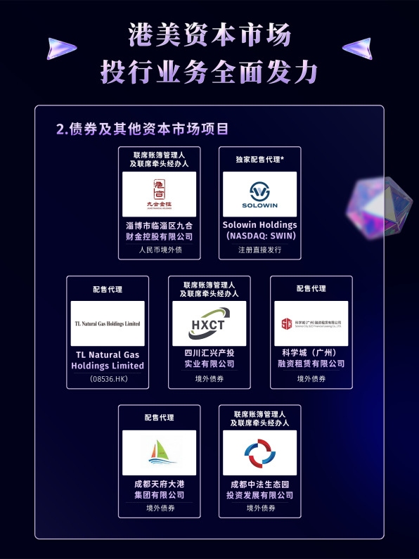 除股权融资外,艾德金融在债券及其他资本市场项目上也取得了显著突破,全年完成了7个相关项目。服务范围涵盖中国地方政府融资平台、国有企业及上市公司,角色包括联席账簿管理人、联席牵头经办人及独家配售代理等。例如,为淄博市临淄区九合财金控股有限公司、四川汇兴产投实业有限公司等机构发行境外债券提供关键支持,同时也为Solowin Holdings (NASDAQ: SWIN)等美股上市公司的注册直接发行担任独家配售代理。这些项目体现了艾德金融在结构化融资、跨境资本运作方面的专业实力,能够为客户提供定制化的债务解决方案。