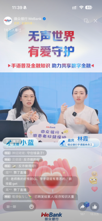 此次消保专场直播共吸引12.3万人次在线观看,收获点赞16.8万次,评论超7000条,反响热烈。活动不仅彰显了微众银行在无障碍服务建设上的探索与成果,也传递了其保障消费者权益、致力普惠金融的坚定承诺。未来,微众银行将继续深化服务,为客户提供更便捷、温暖、安全的金融服务。