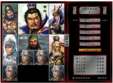 通过移动各个棋子,帮助曹操从初始位置移到棋盘最下方中部,从出口逃走。不允许跨越棋子,还要设法用最少的步数把曹操移到出口。曹操逃出华容道的最大障碍是关羽,关羽立马华容道,一夫当关,万夫莫开。关羽与曹操当然是解开这一游戏的关键。四个刘备军兵是最灵活的,也最容易对付,如何发挥他们的作用也要充分考虑周全。“华容道”有一个带二十个小方格的棋盘,代表华容道。